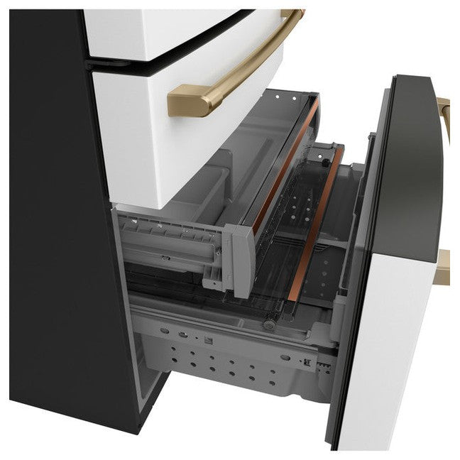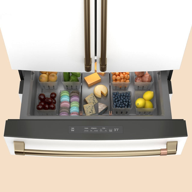 The Café CGE29DP4TW2 French Door Refrigerator combines spacious capacity, advanced food preservation, and refined design to support modern kitchens and everyday living. With a generous 28.7 cu. ft. total capacity, this full-depth French door refrigerator offers ample room for fresh groceries, bulk shopping, and entertaining essentials while maintaining Café’s signature style-forward aesthetic. The elegant Matte White finish creates a warm, contemporary look that pairs beautifully with customizable hardware for a personalized design statement.